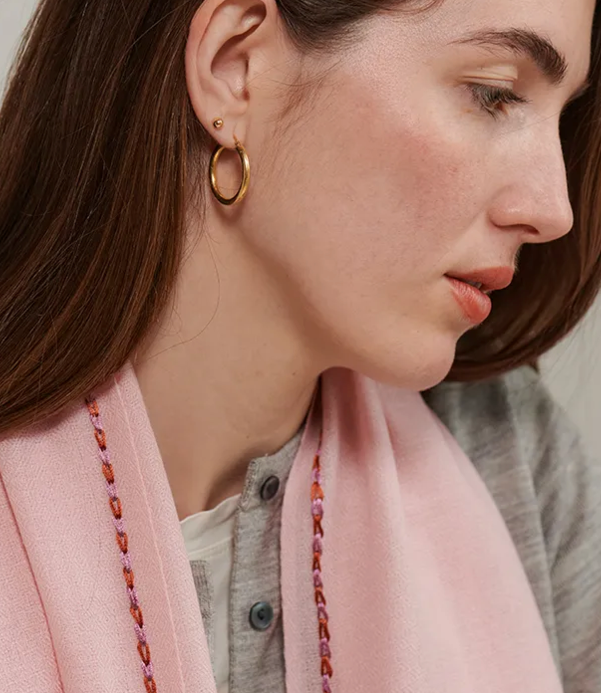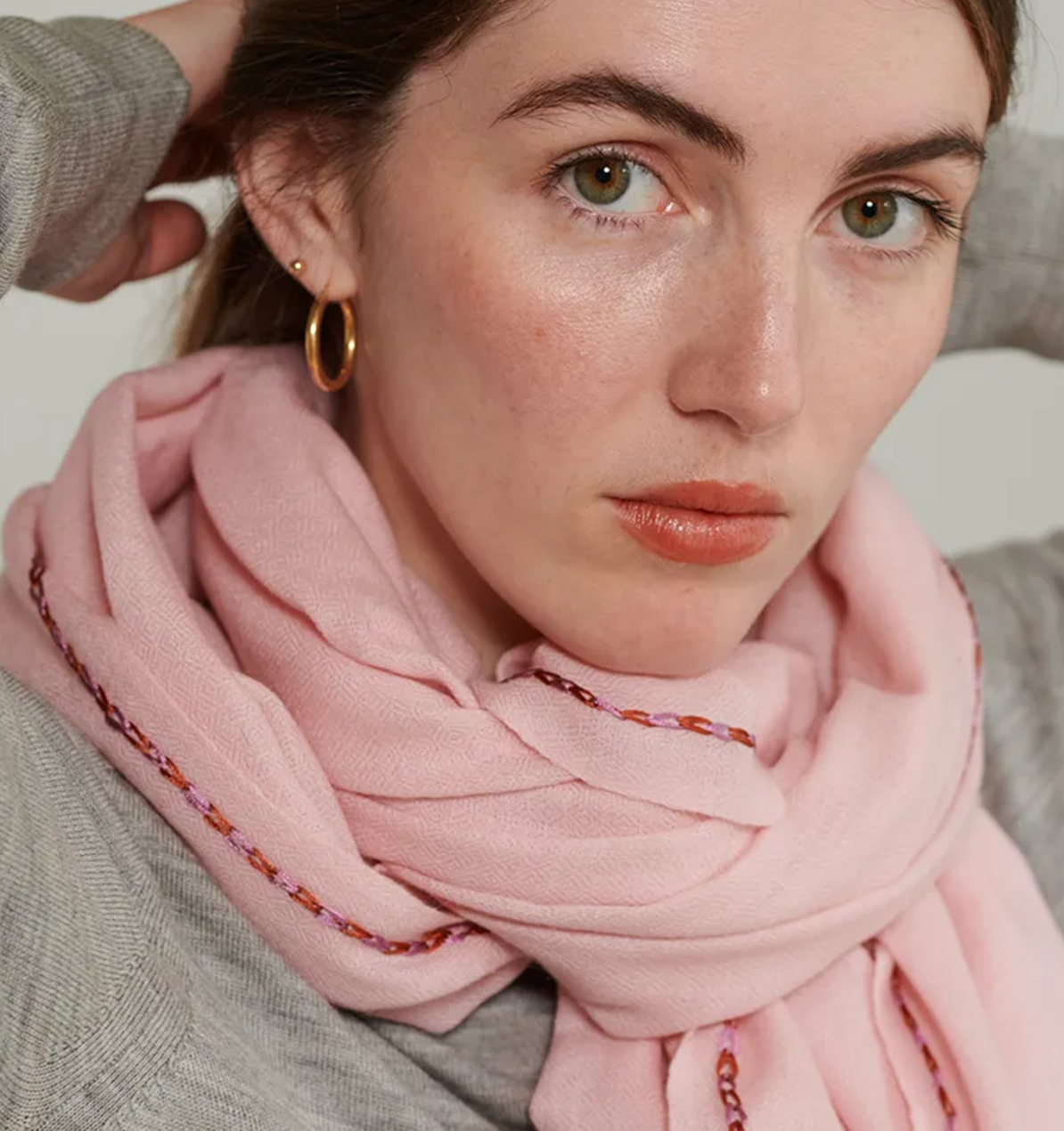 Each scarf features a delicate, hand-embroidered border, adding a distinct and personal touch.
