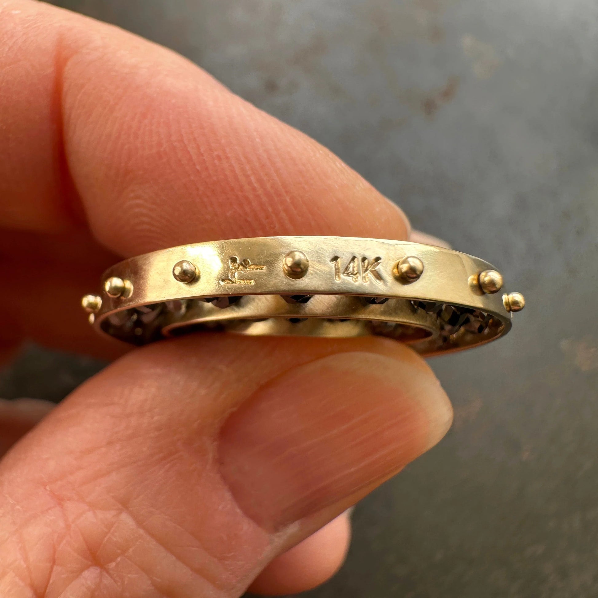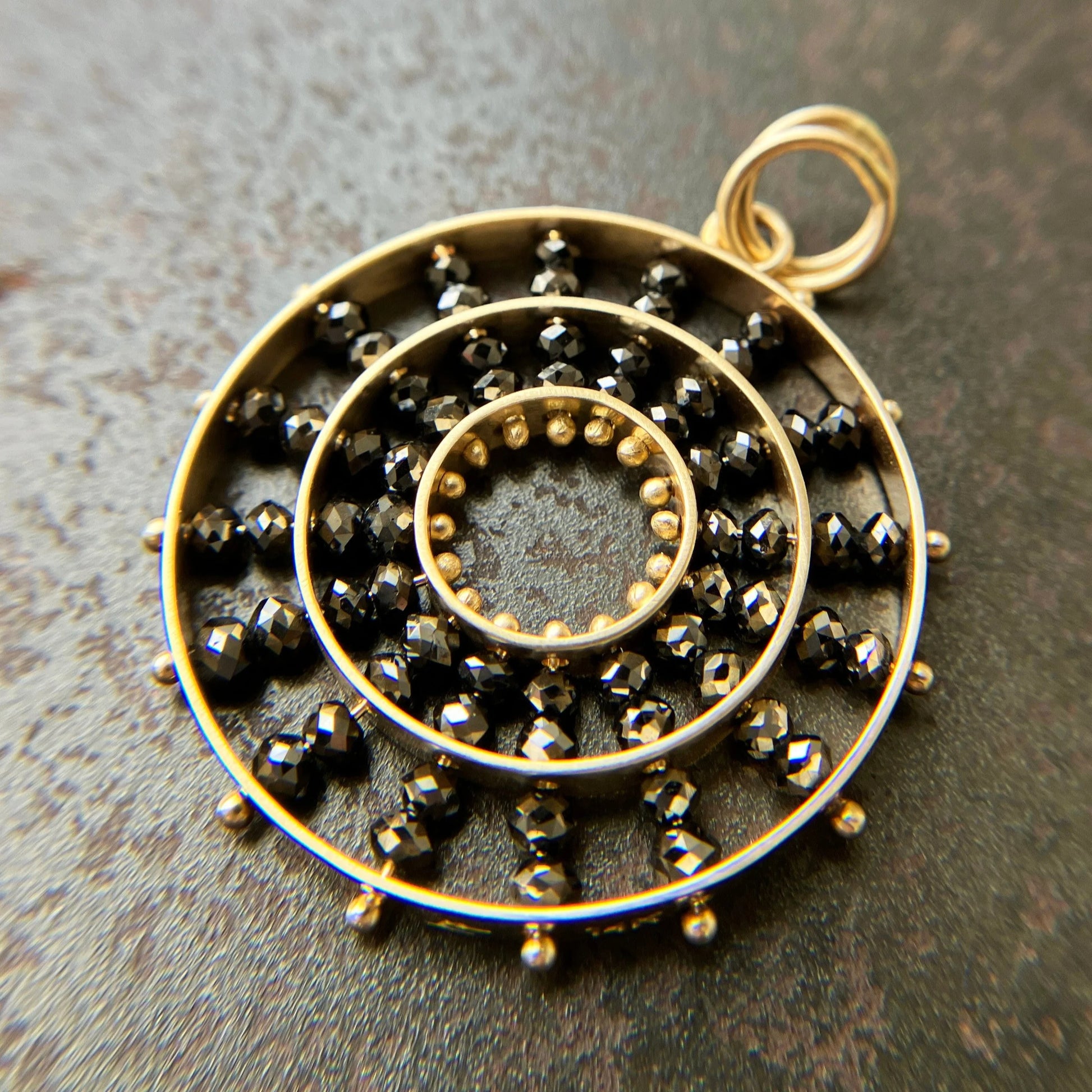 Faceted black diamond beads shimmer with every movement, sparkling within concentric golden circles that echo the timeless symbolism of wholeness, unity, and continuity. A unique pendant that is both elegant and contemporary, and bold and minimal.